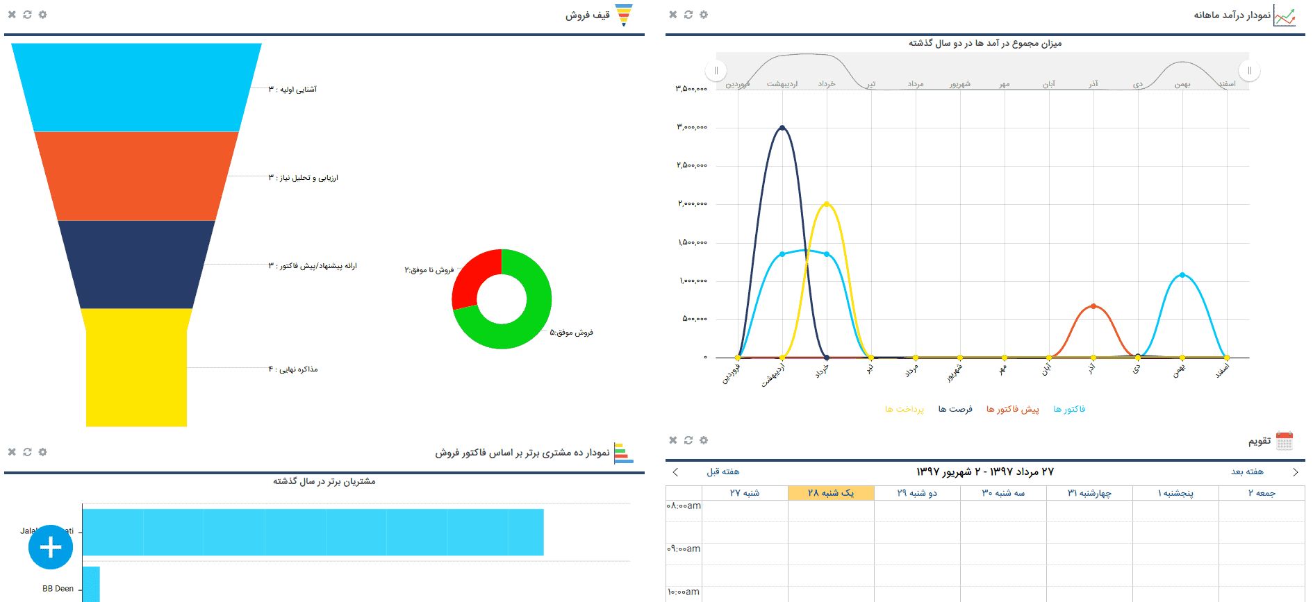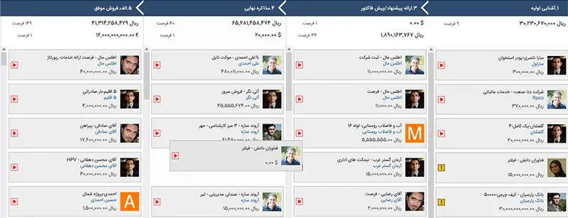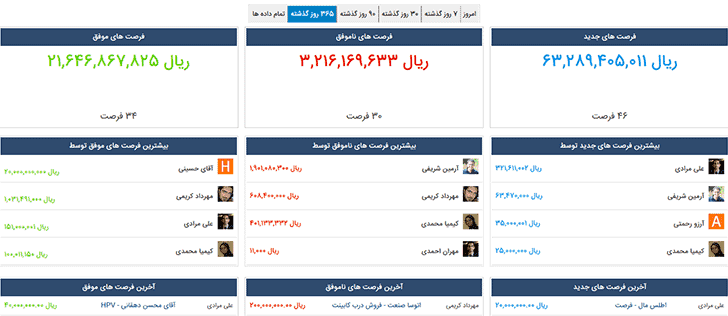 مدیران سازمان با استفاده از کارتابل نرم افزار CRM فارسی خود قادر خواهند بود اطلاعات مفیدی مانند فروشهای جاری، برنامه جلسات و تماسها، پیش فاکتورها، وظایف محول شده به دیگران، نتایج فعالیتهای بازاریابی و تبلیغات و… را مشاهده نمایند.